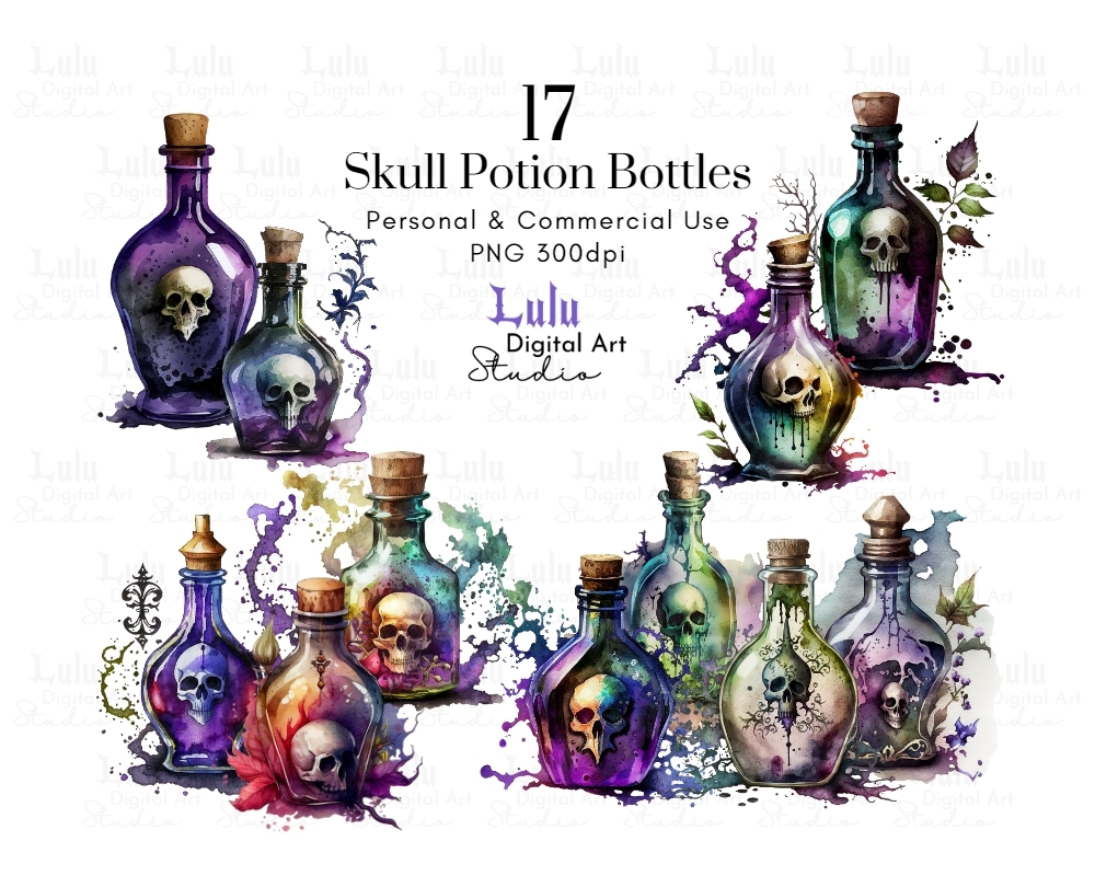 Introducing a collection of 17 Skull Potion Bottles digital clip art, perfect for adding a touch of dark magic and gothic ambiance to your digital creations. Each potion bottle features a detailed skull design that is both eerie and enchanting, making them perfect for use in a variety of creative projects. Use them to add a touch of mysticism to your social media graphics, website design, or digital scrapbooking projects. These high-quality PNG images have transparent backgrounds, making them easy to layer and incorporate into your designs. Use them individually or as a set to create a spellbinding display of dark magic. Whether you're a fan of witchcraft, fantasy, or just love the gothic aesthetic, this clip art collection is sure to inspire your imagination and add a touch of enchantment to your creations. Buy now and start adding a little dark magic to your digital art projects!