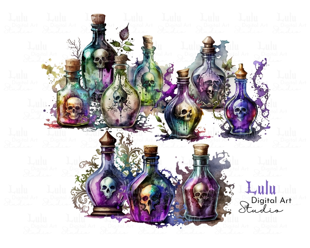 Introducing a collection of 17 Skull Potion Bottles digital clip art, perfect for adding a touch of dark magic and gothic ambiance to your digital creations. Each potion bottle features a detailed skull design that is both eerie and enchanting, making them perfect for use in a variety of creative projects. Use them to add a touch of mysticism to your social media graphics, website design, or digital scrapbooking projects. These high-quality PNG images have transparent backgrounds, making them easy to layer and incorporate into your designs. Use them individually or as a set to create a spellbinding display of dark magic. Whether you're a fan of witchcraft, fantasy, or just love the gothic aesthetic, this clip art collection is sure to inspire your imagination and add a touch of enchantment to your creations. Buy now and start adding a little dark magic to your digital art projects!